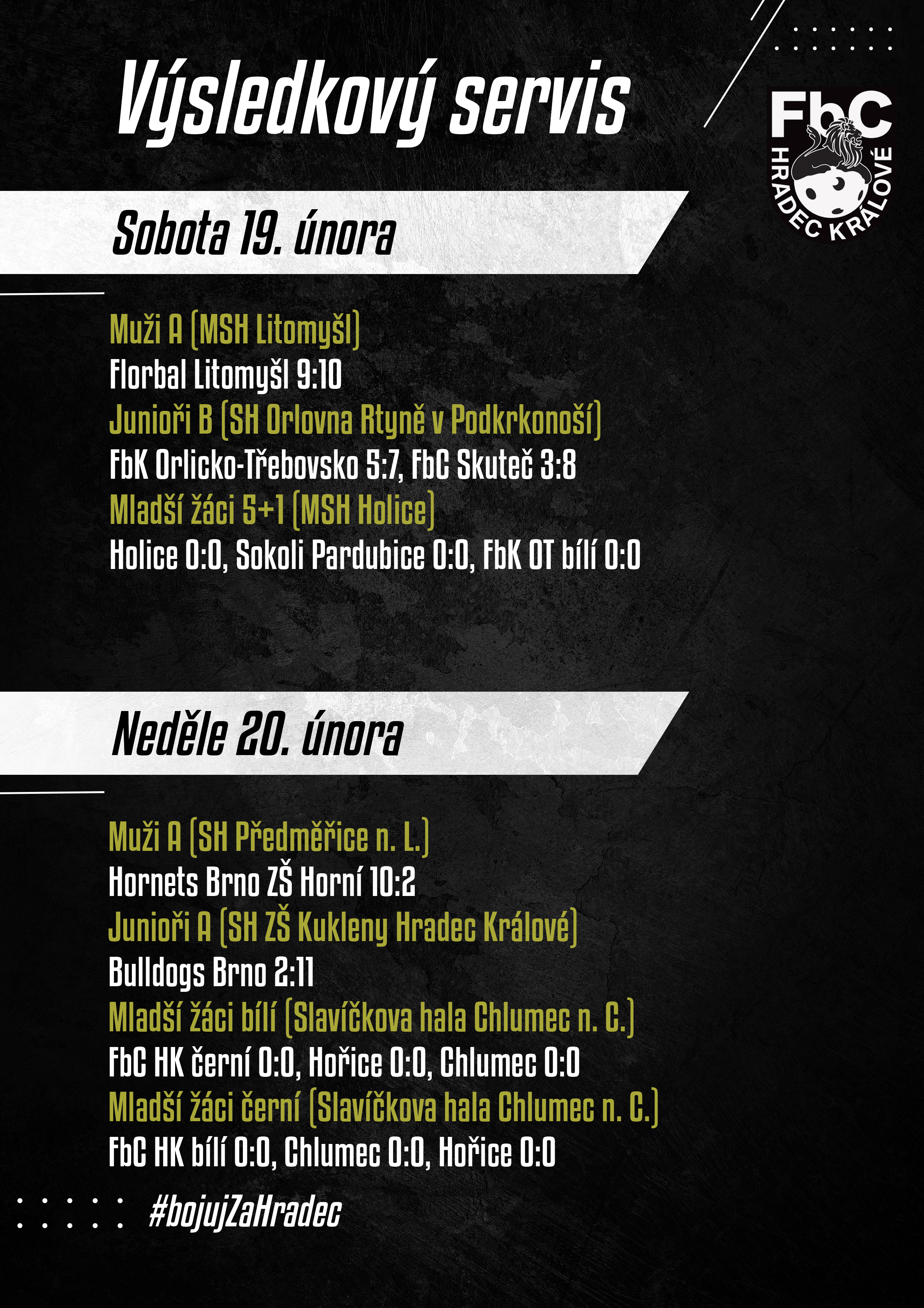 Muži "A" v sobotu zaváhali s Litomyšlí, která nám utnula sérii 9 výher v řadě a zachránila se v soutěži. V neděli nás čekal jeden z klíčových zápasů v rámci boje o postup do play-up s Hornets Brno, kteří již před našim zápasem měli jistotu prvního místa. Motivace a nasazení od začátku až do konce byla jednoznačně na naší straně a po 60 minutách na výsledkové tabuli svítilo skóre 10:2, což znamenalo zisk důležitých 3 bodů. Ve čtvrtek nás čeká zřejmě zápas o všechno s Blanskem, které je pouze o 2 body za námi.