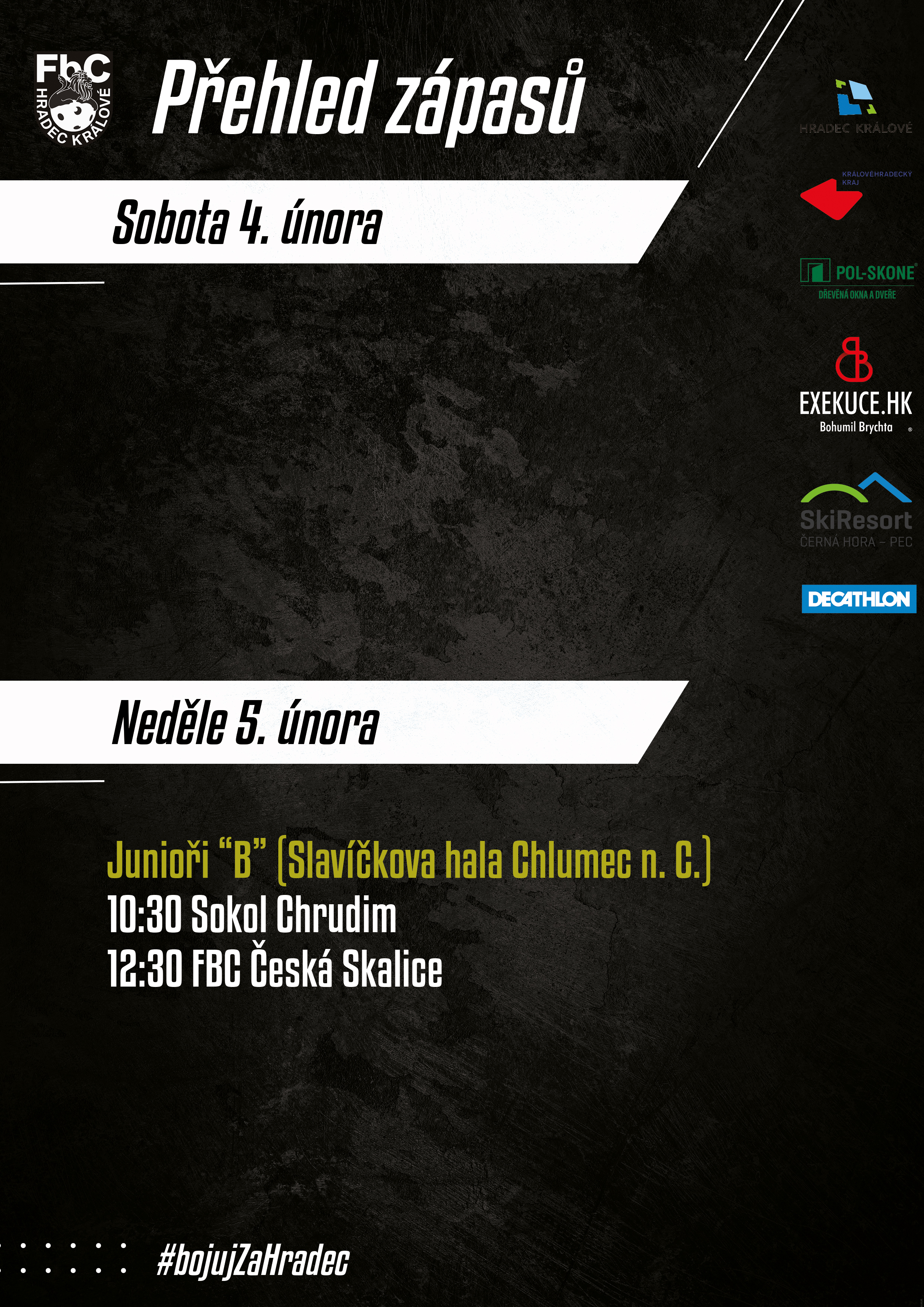 Tento víkend je pro převážnou většinu našich týmů odpočinkový. Jediný, kdo do zápasu nastoupí, jsou Junioři "B", kteří se v neděli vypraví do Chlumce nad Cidlinou.